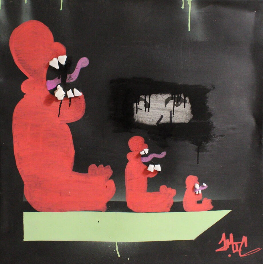 "PEEPING TOM MEETS DYSFUNCTIONAL FAMILY", 2023, Mixed media on canvas - 36 in x 36 in x 1.5 in