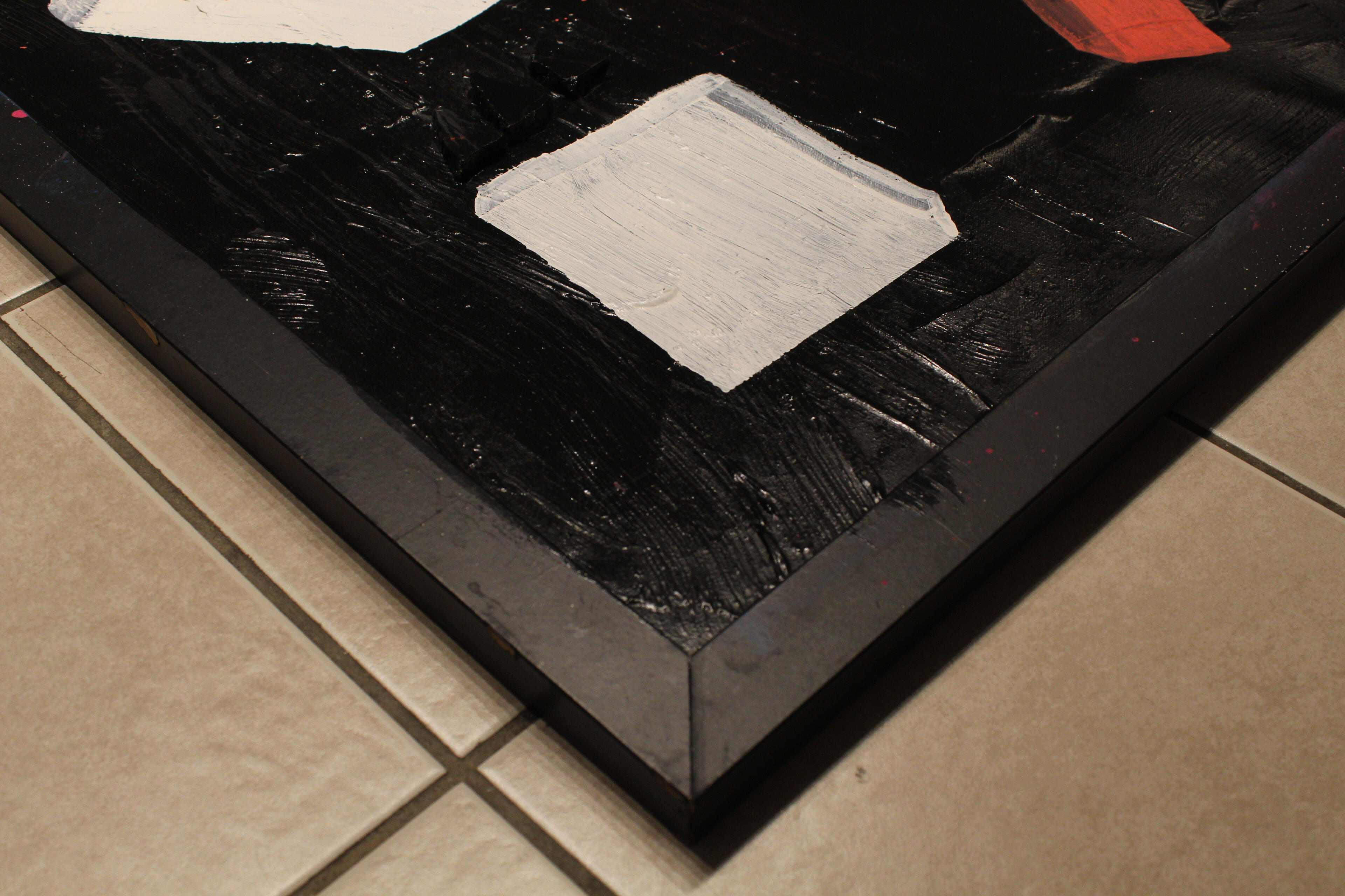 "BLACK ON RED DINING TABLE", 2024, Mixed media on cardboard, in wooden frame - 40 in x 25 in x 1.5 in